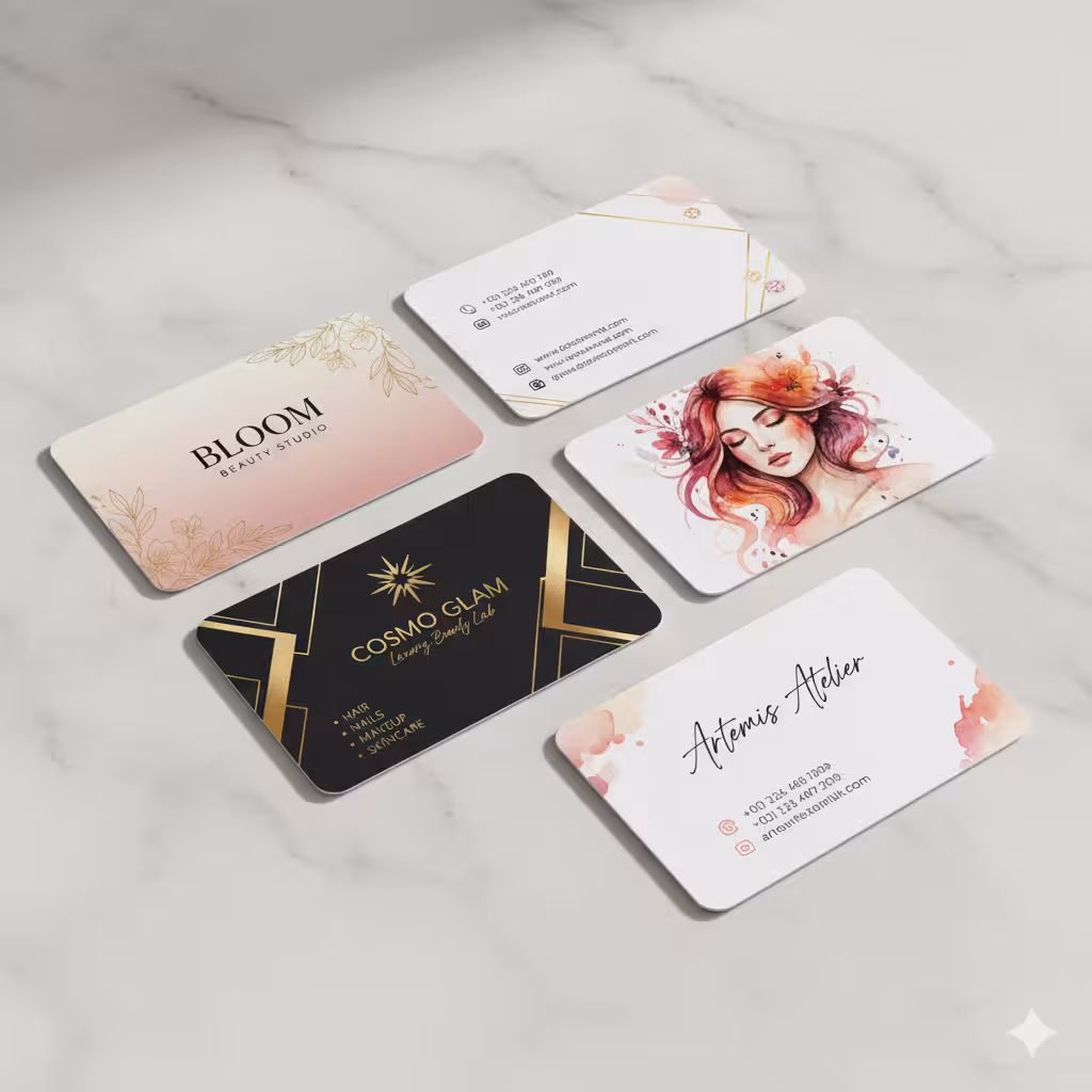 کارت ویزیت لاکچری سالن زیبایی با طراحی خاص، رنگبندی چشمنواز و چاپی با کیفیت بالا، حس ظرافت و زیبایی را به مشتری منتقل میکند. از متریالهای خاص مثل کارت فلزی، لمینت براق یا مخملی گرفته تا طلاکوب و نقرهکوب، همه چیز در آن برای جلوهای خاص و متفاوت طراحی شده است.